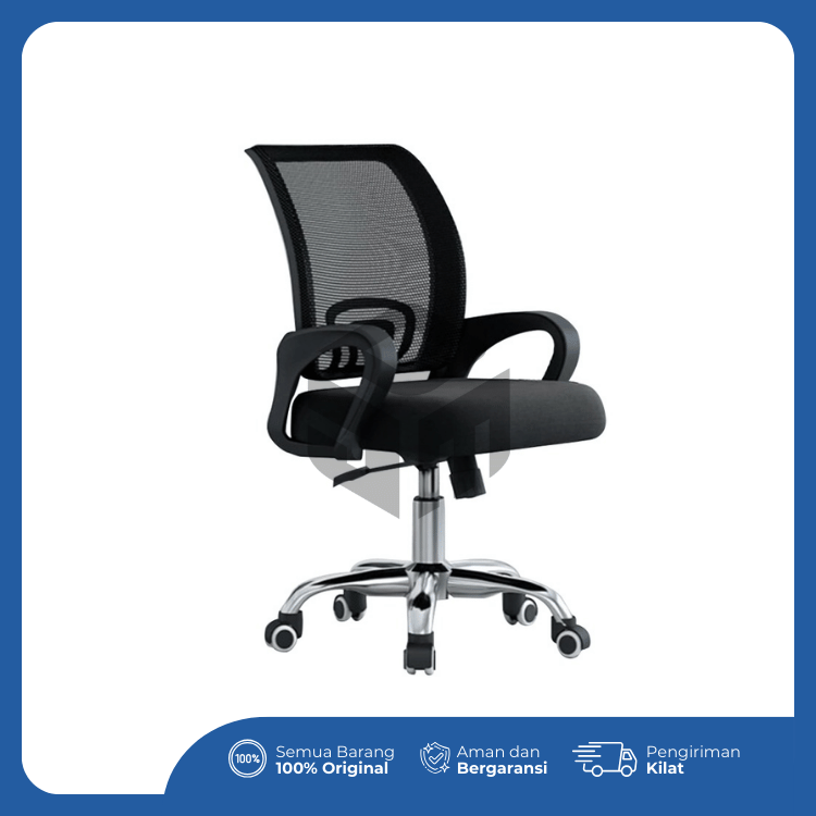Kursi kantor ergonomis dengan desain modern yang dilengkapi sandaran jaring (mesh) untuk sirkulasi udara optimal, menjaga kenyamanan selama bekerja dalam waktu lama. Dudukan empuk dengan busa berkualitas tinggi dan tuas hidrolik untuk pengaturan tinggi kursi membuat posisi duduk lebih fleksibel. Dilengkapi roda putar 360° dan rangka kaki berbahan krom yang kuat serta tahan lama, kursi ini cocok digunakan di kantor, ruang kerja, maupun home office.